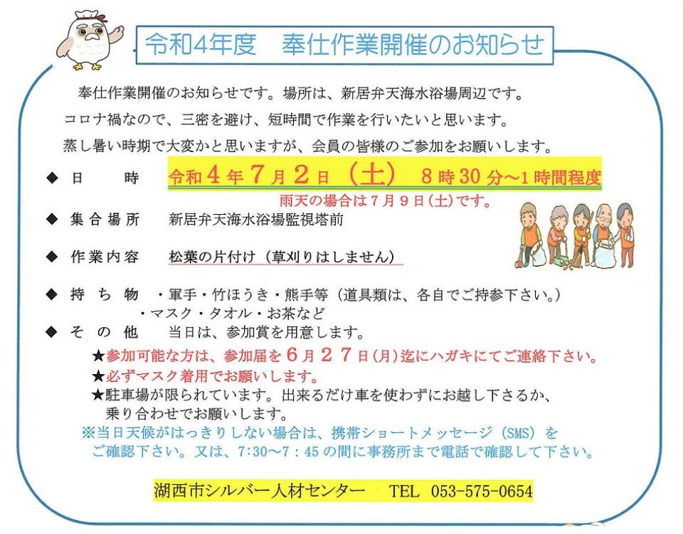 参加可能な方は湖西市シルバー人材センターまでお電話いただくか、