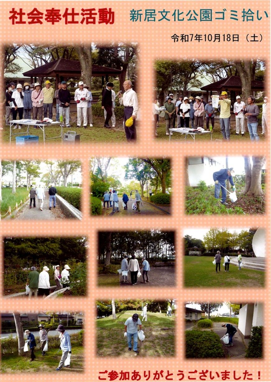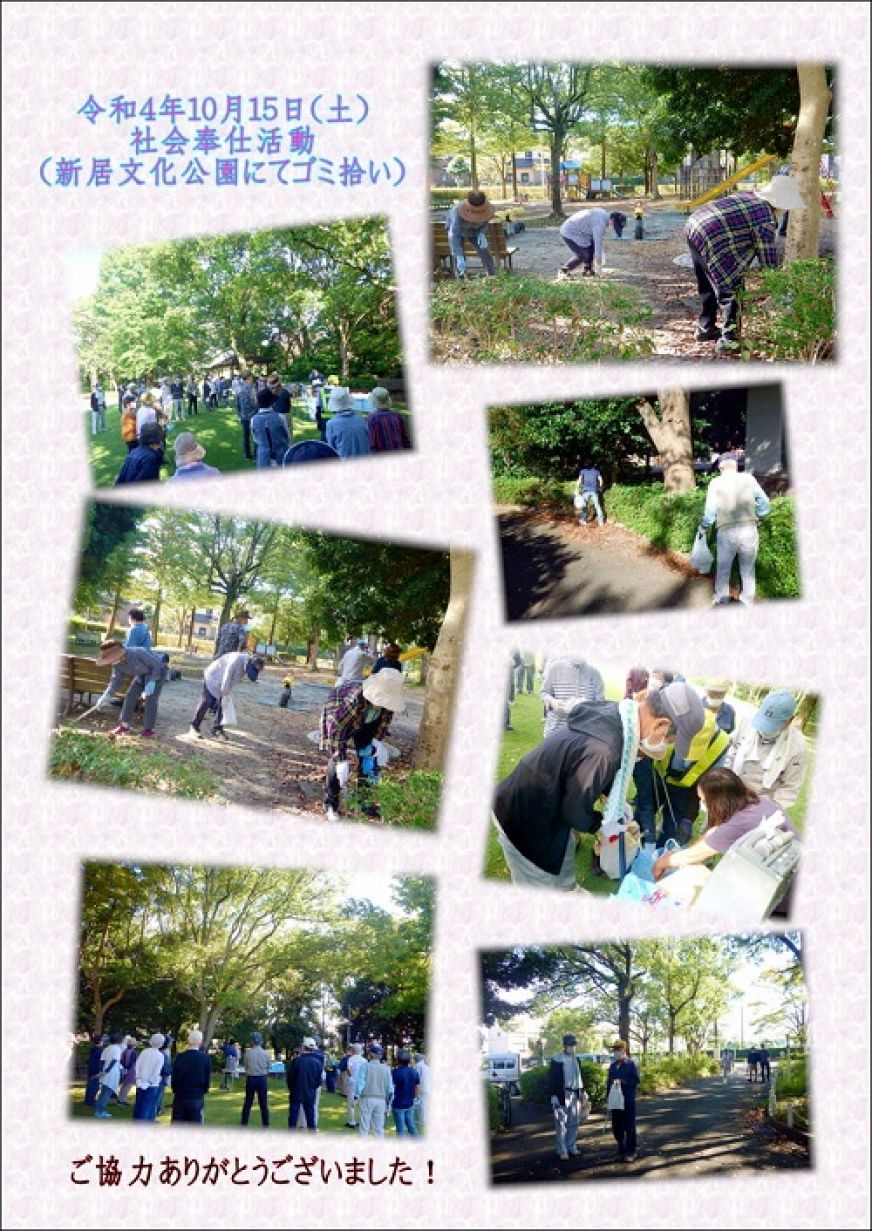 10月はシルバーの普及啓発月間です。今回は、新居文化公園周辺のゴミ拾いを行います。会員の皆様のご参加をお願いします。