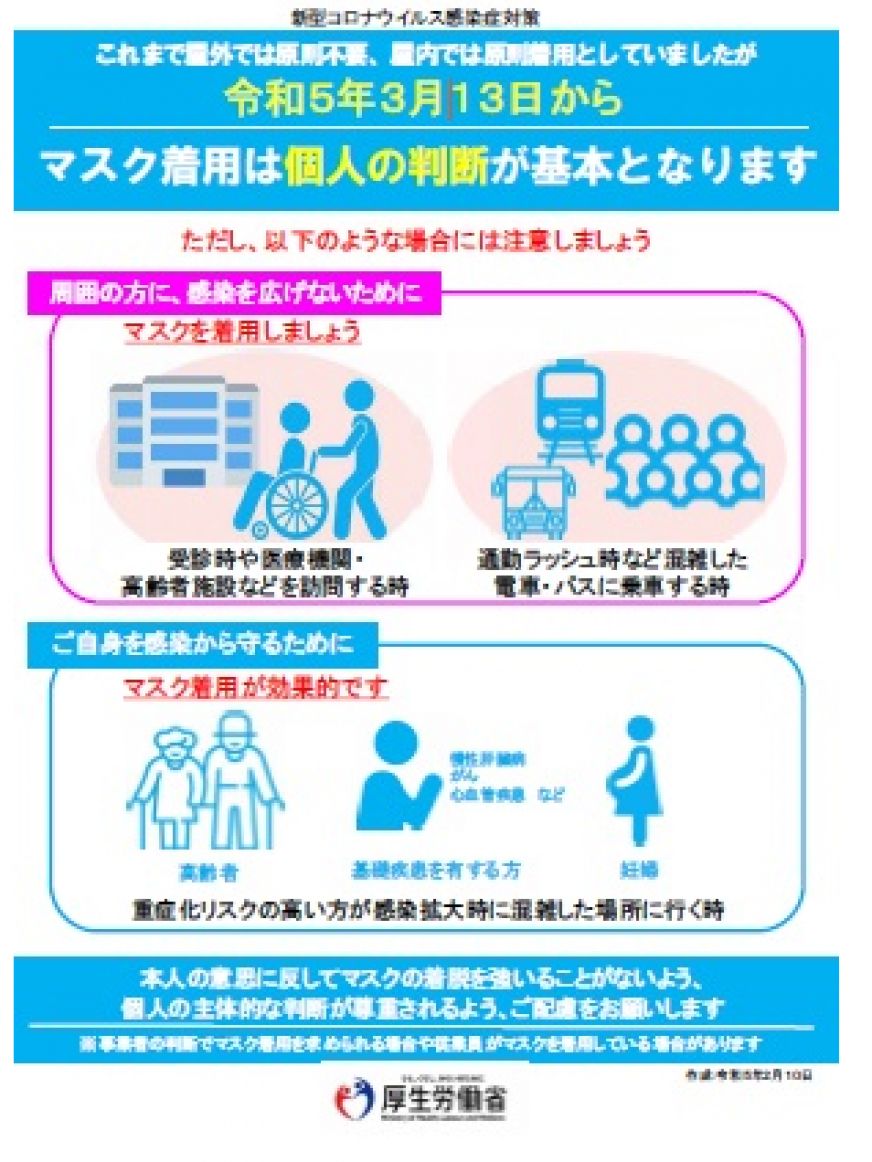 センターをご利用になる皆様におかれましても、マスクの着用は個人の判断でお願いいたします。また、体調がすぐれない場合は、無理せずご来所をお控えいただくなど、引き続きご自身の体調管理にご留意くださいますようお願い申し上げます。