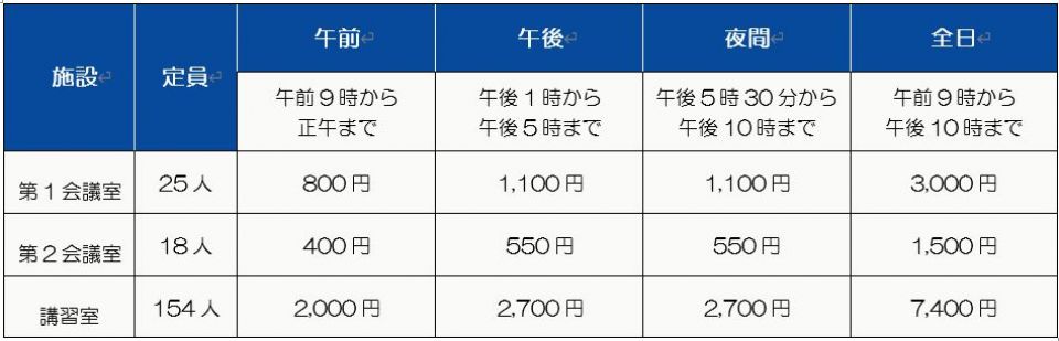 施設使用料金表 ↓クリックすると拡大します。