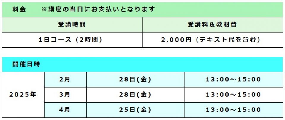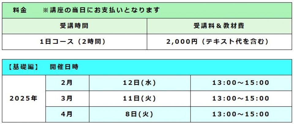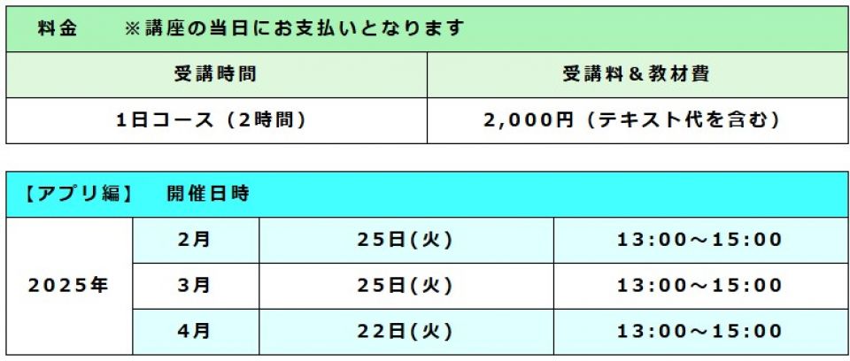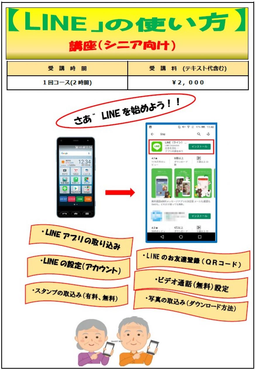 スマホ講座【基礎編】/スマホ講座【アプリ編】/【Line】の使い方講座 ◆スマホ講座【基礎編】 ●スマホ講座【基礎編】の内容● ↓クリックすると拡大します スマホを購入したばかりで電話しか使えない、周りの人に聞くけれど機種が違うと操作方法違うのでよくわからない、使っているけれども使い方がよくわからないという初心者の方を対象としています。 ◆ホーム画面の構成 ◆文字入力の方法 ◆E-メールの送受信方法 ◆写真とビデオの撮り方と見る方法 ◆QRコード(2次元バーコード)の使い方 ※Android版、iPhone版どちらのスマホをお持ちの方でも受講できます。 7●料金・開催日時● ↓クリックすると拡大します (2025.12.20更新) ◆スマホ講座【アプリ編】 ●スマホ講座【アプリ編】の内容● ↓クリックすると拡大します スマホには便利なアプリあるいは楽しいアプリが用意されています。 そのアプリを使ってみたい、アプリを新しく追加したいという方を対象にしています。 ◆音声検索の方法 ◆マップの使い方 ◆アプリを追加する方法 ◆「radiko」の使い方 ◆「YouTube」の使い方 ◆「NHKニュース・防災」の使い方 ※Android版、iPhone版どちらのスマホをお持ちの方でも受講できます。 ●料金・開催日時● ↓クリックすると拡大します (2025.12.20更新) ◆【LINE】の使い方講座(シニア向け) ●【LINE】の使い方講座の内容● ↓クリックすると拡大します この講座は、スマホで「LINE」を使いたい、あるいは使っているけれども使い方が今一つよくわからないという「シニアの方」を対象にしています。 ☆LINEアプリの取込み ☆LINEの設定(アカウント) ☆LINEのお友達登録(お友達、お孫さん) ☆LINEでのビデオ通話設定 ☆LINEからの写真取込み・スタンプ取込み ※Android版、iPhone版どちらのスマホをお持ちの方でも受講できます。 ●料金・開催日時● ↓クリックすると拡大します (2025.12.20更新)