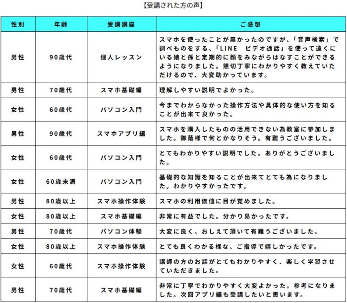 実際に受講されたお客様、また個人レッスンをご利用いただいたお客様から寄せられた“生のお声(一部)”をご紹介します。」とする。
