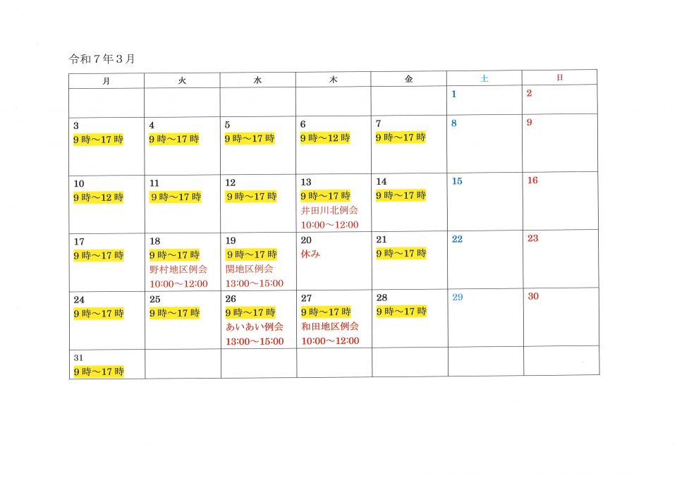 受付9時から17時 ※専属の職員が対応しています。下記のカレンダーで対応日時をご確認下さい。 地区例会は担当者がそちらに行っていますので不在となります。