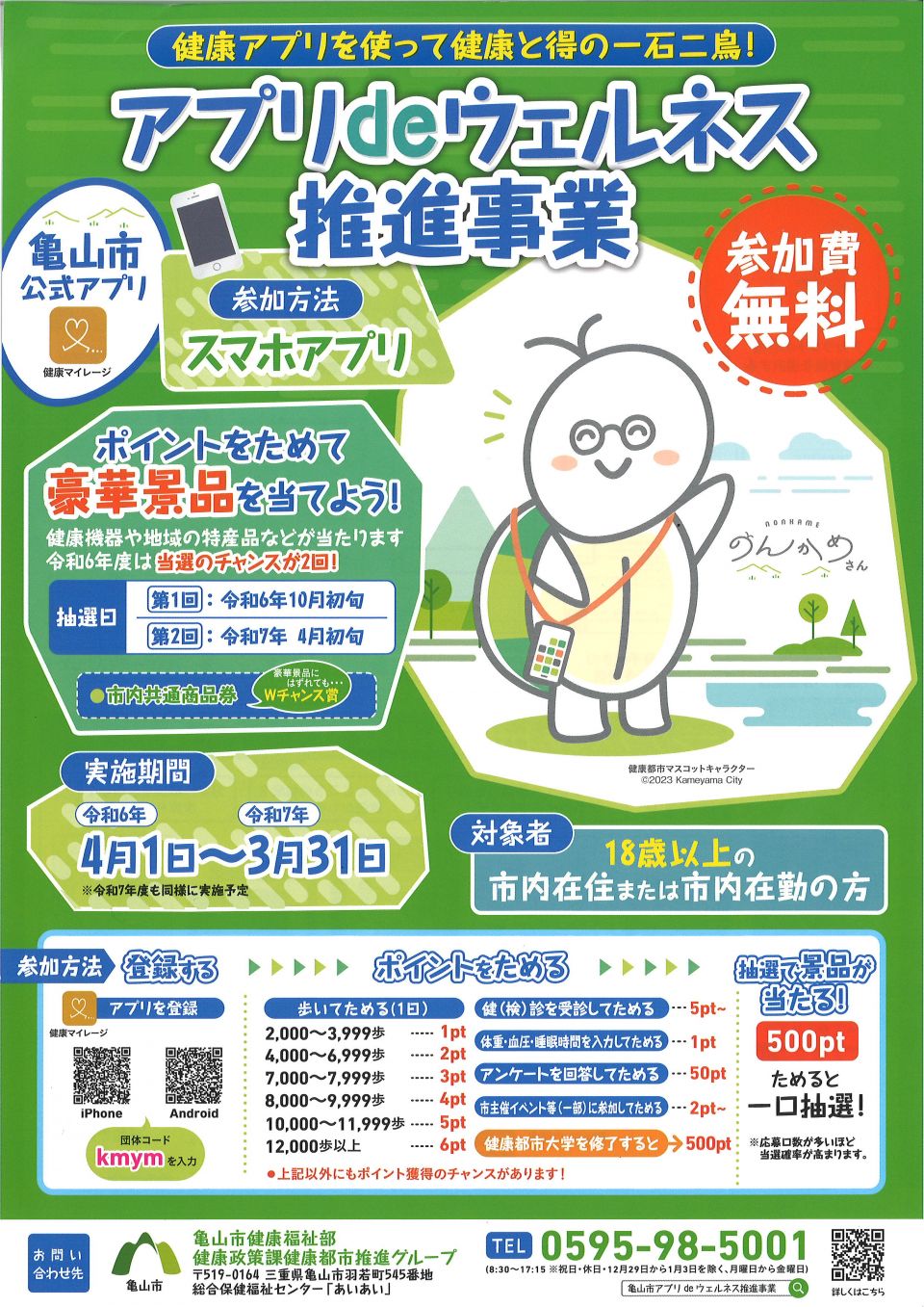 目的(亀山市HPより) 健康寿命の延伸に向け、平成30年度から取り組んできた、かめやま健康マイレージ事業を、より幅広い世代が手軽に参加できるよう、スマートフォンアプリケーション(以下、「アプリ」という)を活用する事業へとリニューアルすることで、個人が自身の健康意識の向上や、健康習慣の見直しを図り、主体的な健康活動の実践を図ります。
