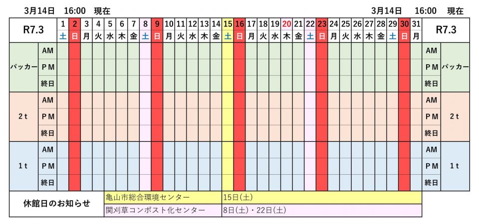 雨天共用車貸出基本禁止。※(理由 令和6年度の事例)大丈夫と無理にパッカーを移動させ、ぬかるみ(泥沼)にハマり自力で脱出ができない。(年に数回発生)亀山市内にレッカー(救助)をする業者なし。(JAFは特殊車両対応不可)また脱出の際に長時間、半クラッチでエンジンを高回転させたためパッカーが故障となり高額な修理費が発生。次の日にパッカー車を使用したい会員(班)に大変迷惑をかけました。雨天の作業で工期が決まっている場合は事務局職員が発注先と工期の調整をしますので相談をしてください。