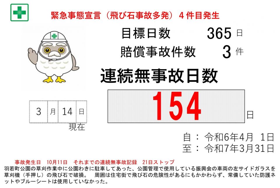 安全第一・センター連続無事故日数記録表