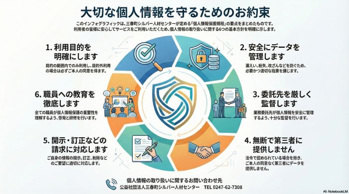(公社)三春町シルバー人材センター(以下「当センター」)は、当センター規程「個人情報の保護に関する規程」に基づき、以下のとおり、個人情報保護の重要性を認識した取組みを徹底します。