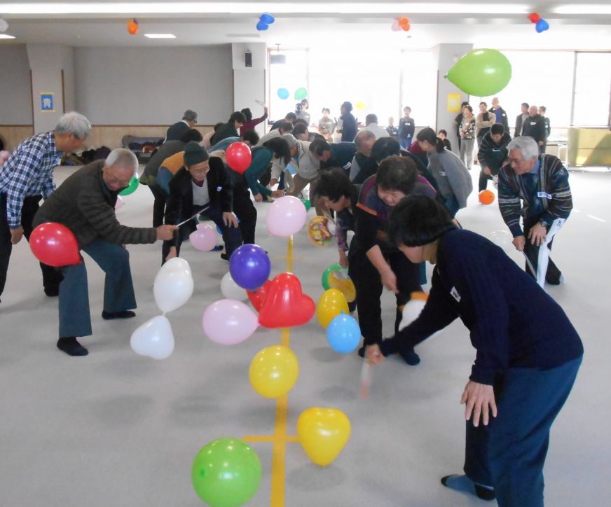 ニュースポーツ大会が南条保健福祉センターで開催され、会員29人がスティックリングを楽しみました。的を狙っての一打一打にヒートアップし、会場は熱気と歓声にあふれました。
