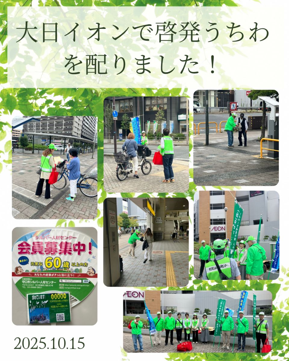 本日、大日イオン前で啓発活動として守口市シルバーのうちわとティッシュ、そして、シルバーフェア案内のチラシを配りました。