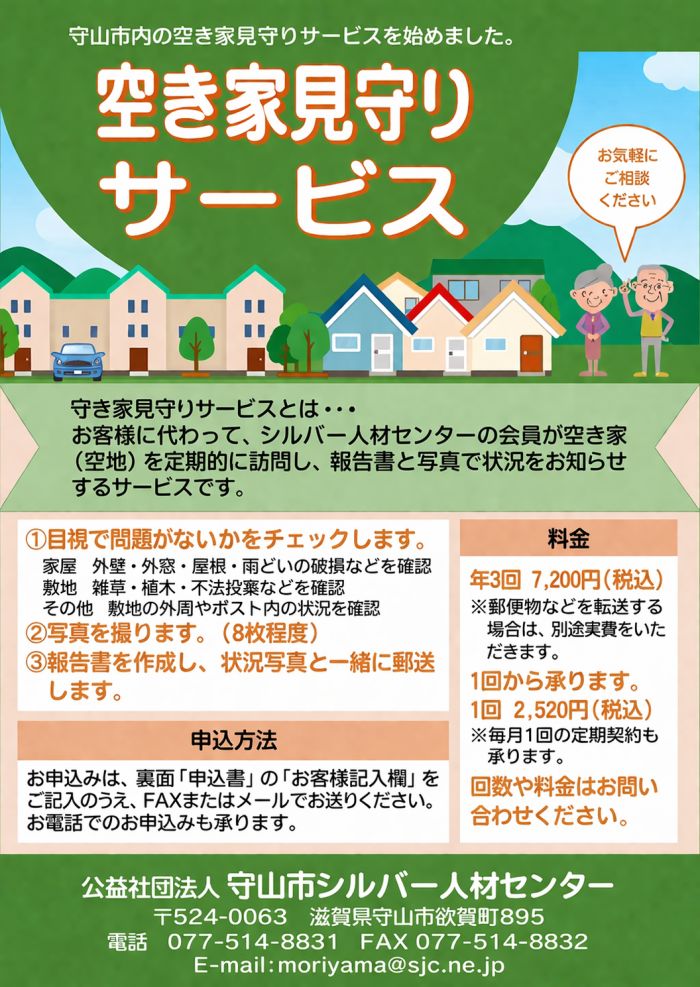空き家見守りサービスとは・・・お客様に代わって、シルバー人材センターの会員が空き家(空地)を定期的に訪問し、報告書と写真で状況をお知らせするサービスです。回数等はご相談に応じます。お気軽にお問い合わせください。
