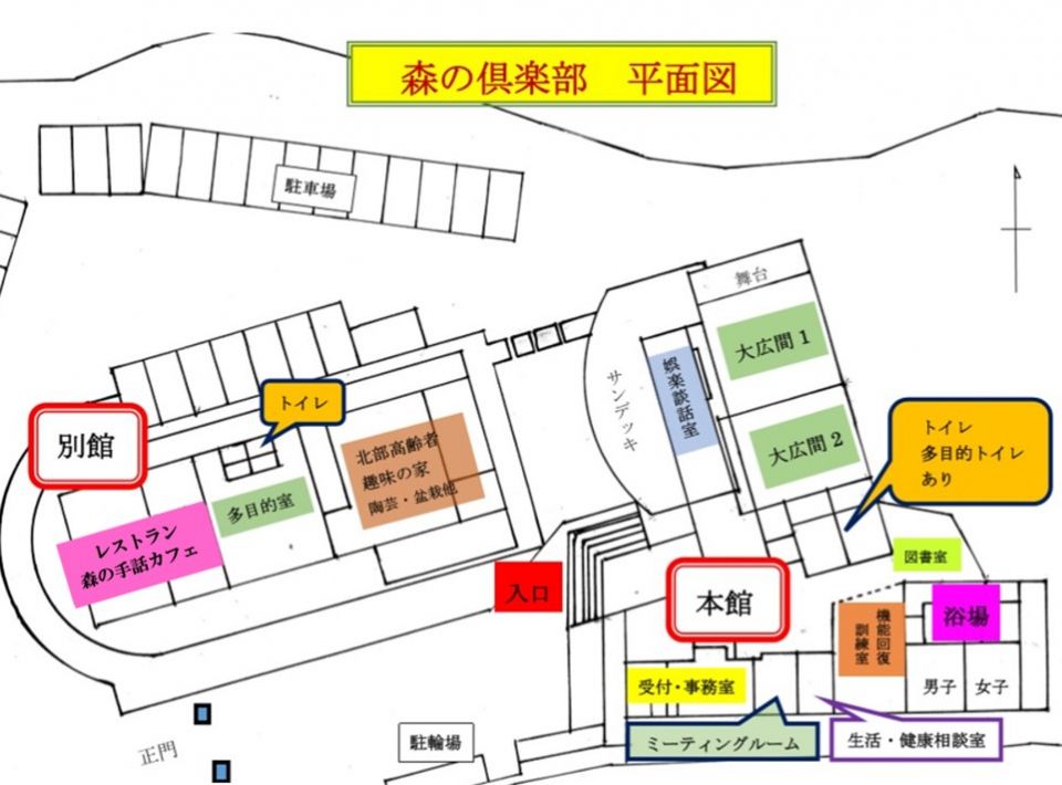 本館には、受付、団体専用施設、個人利用施設、浴室があります。