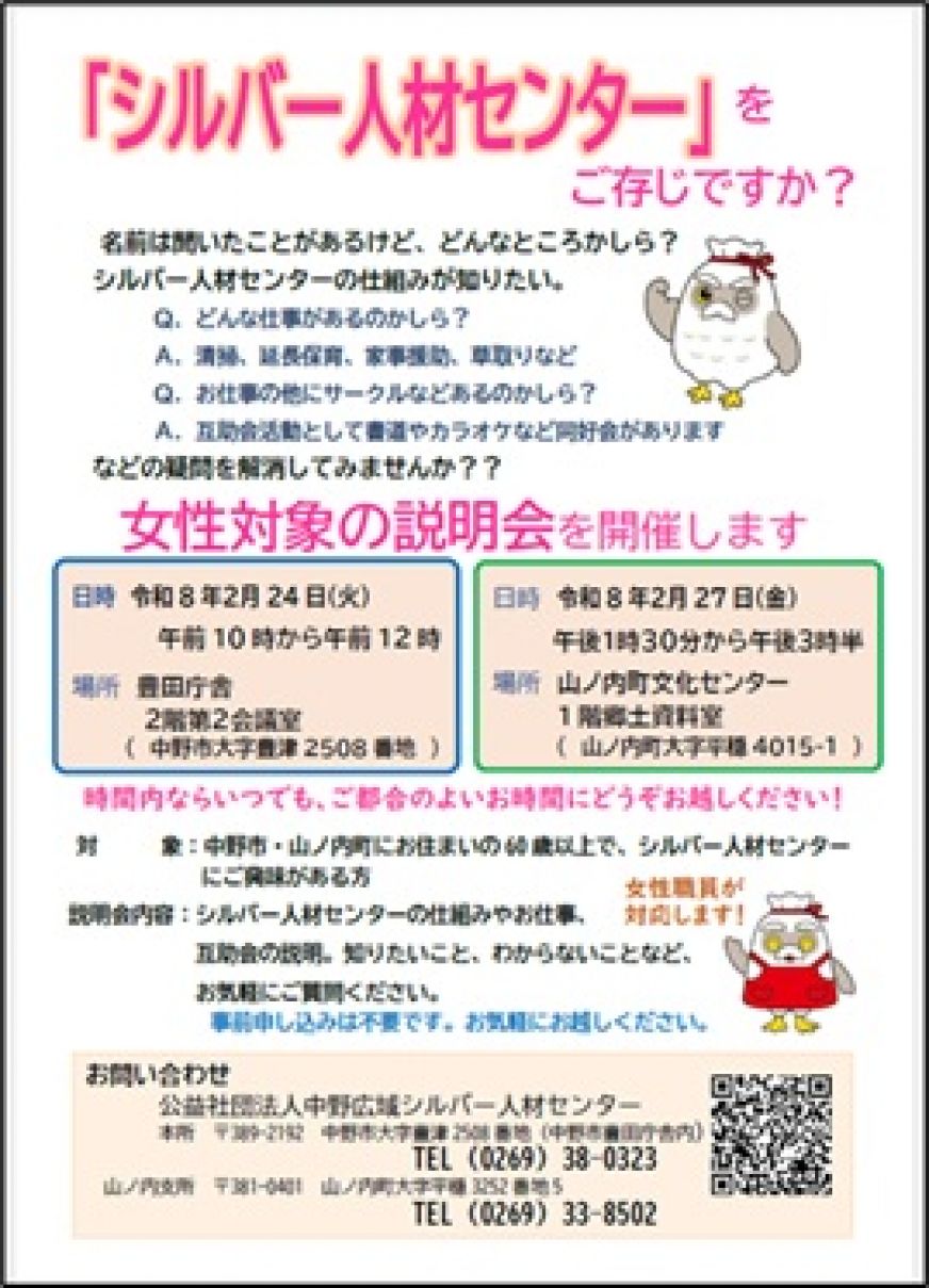 この機会に、シルバー人材センターを知ってみませんか? 対象は、中野市・山ノ内町にお住まいの60歳以上の女性で、 シルバー人材センターにご興味がある方 事前申し込みは不要です。お気軽にお越しください。