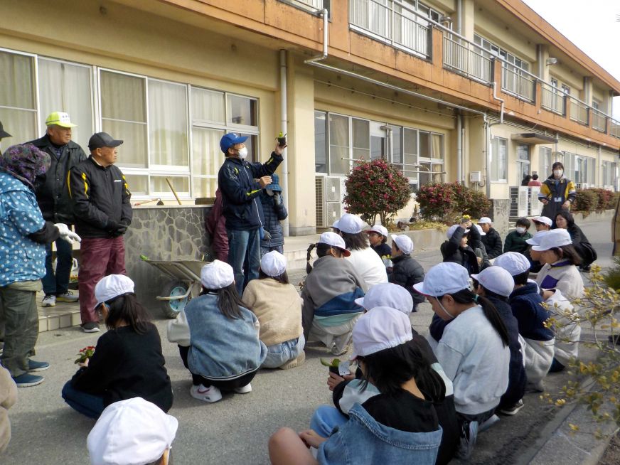 令和8年2月20日(金)西尾市立一色中部小学校にて、20人が花の植替えを生徒さんと一緒に実施しました。