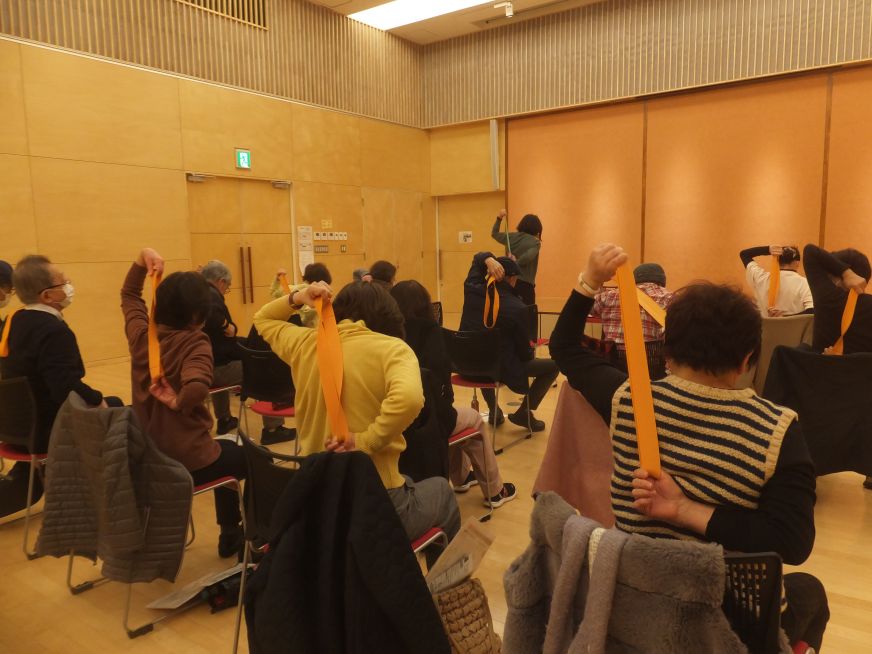 センターで作っている健康体操のゴムを使った体操や血圧測定、健康講和等盛り沢山の内容で開催しました。