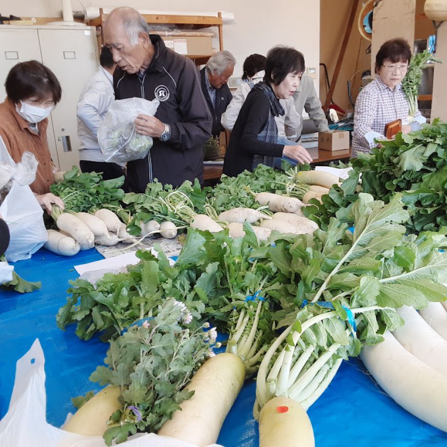 「秋の大根市」と銘打って、大根、ねぎ、さつまいもなどを”ちょっこし”販売しました。たくさんの方にご来場いただき、開店から1時間で完売となりました。野菜班の面々もホッとした様子で、早速、次回に向けて打合せをしていました。