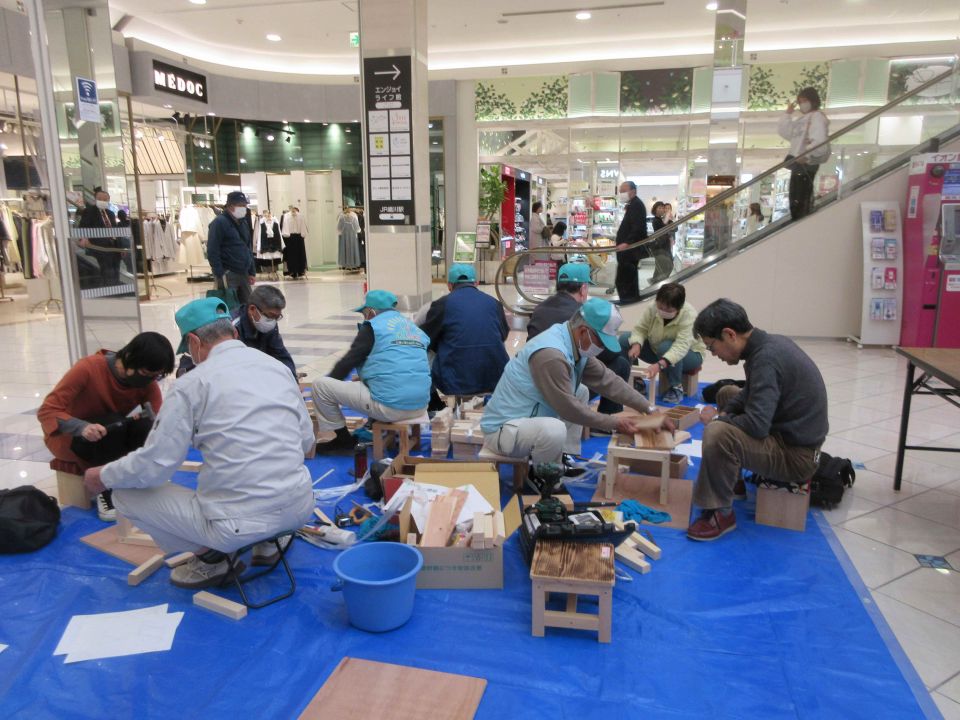 木工班の会員が子供たちに椅子作りを指導する「ちびっこ木工教室」を行いました。また、会員募集のポケットティッシュを配布して、センターの普及啓発も行いました。