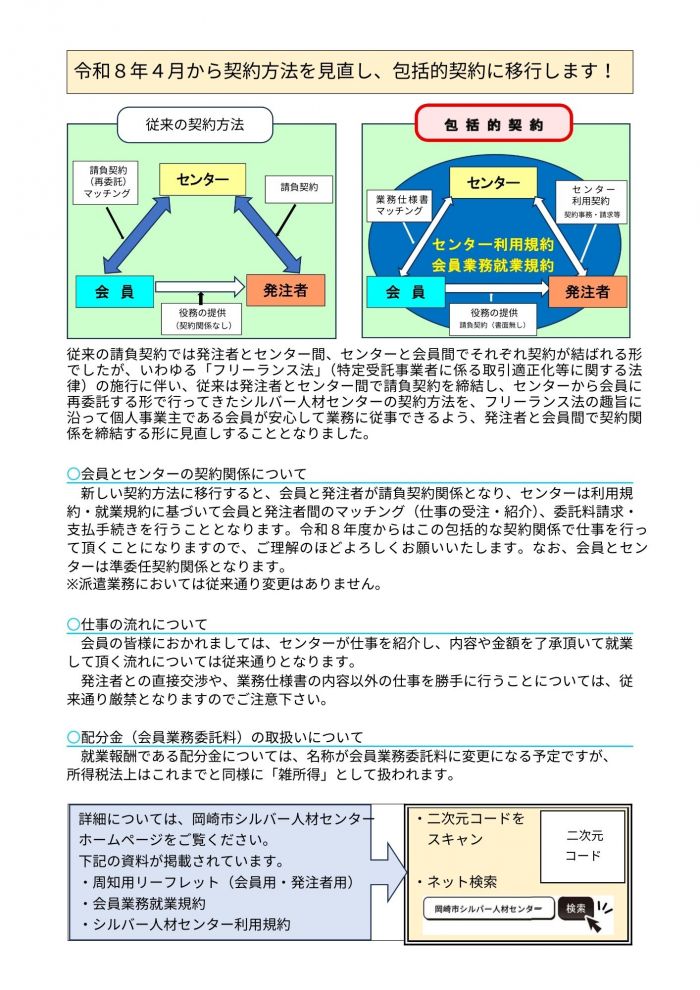これに伴い、岡崎市シルバー人材センターは令和8年4月1日から契約方法の見直し(包括的契約の移行)を行います。