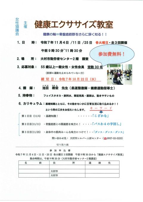 昨年も大好評につき今年も「健康エクササイズ教室」を開催します。本年も池田寿栄先生を迎えて開催致します!参加費は無料です。