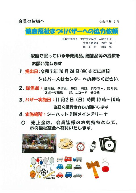 普及啓発活動として「健康福祉まつり」へバザーを出店予定です。会員の皆さんの家で眠っている未使用品、贈答品の提供をお願い致します。