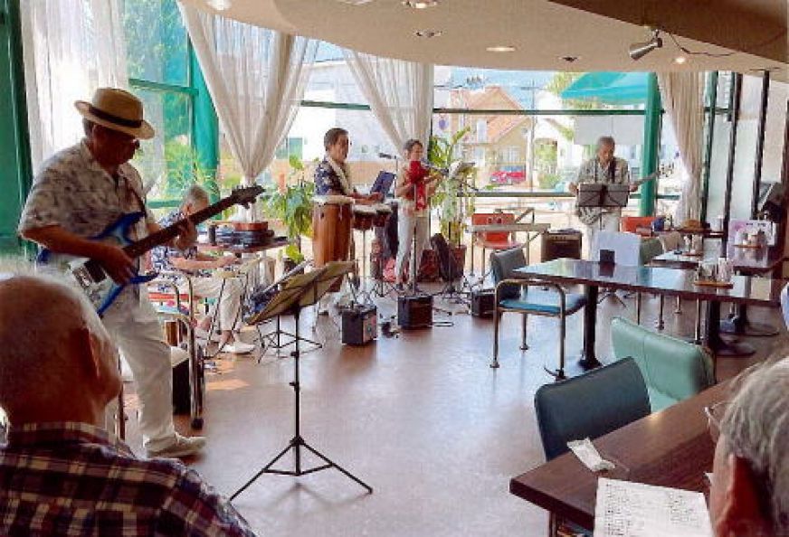 当日はアロハウィンズの約1時間にわたるハワイアンや懐メロなどの生演奏を聴き、その後、食事をしな