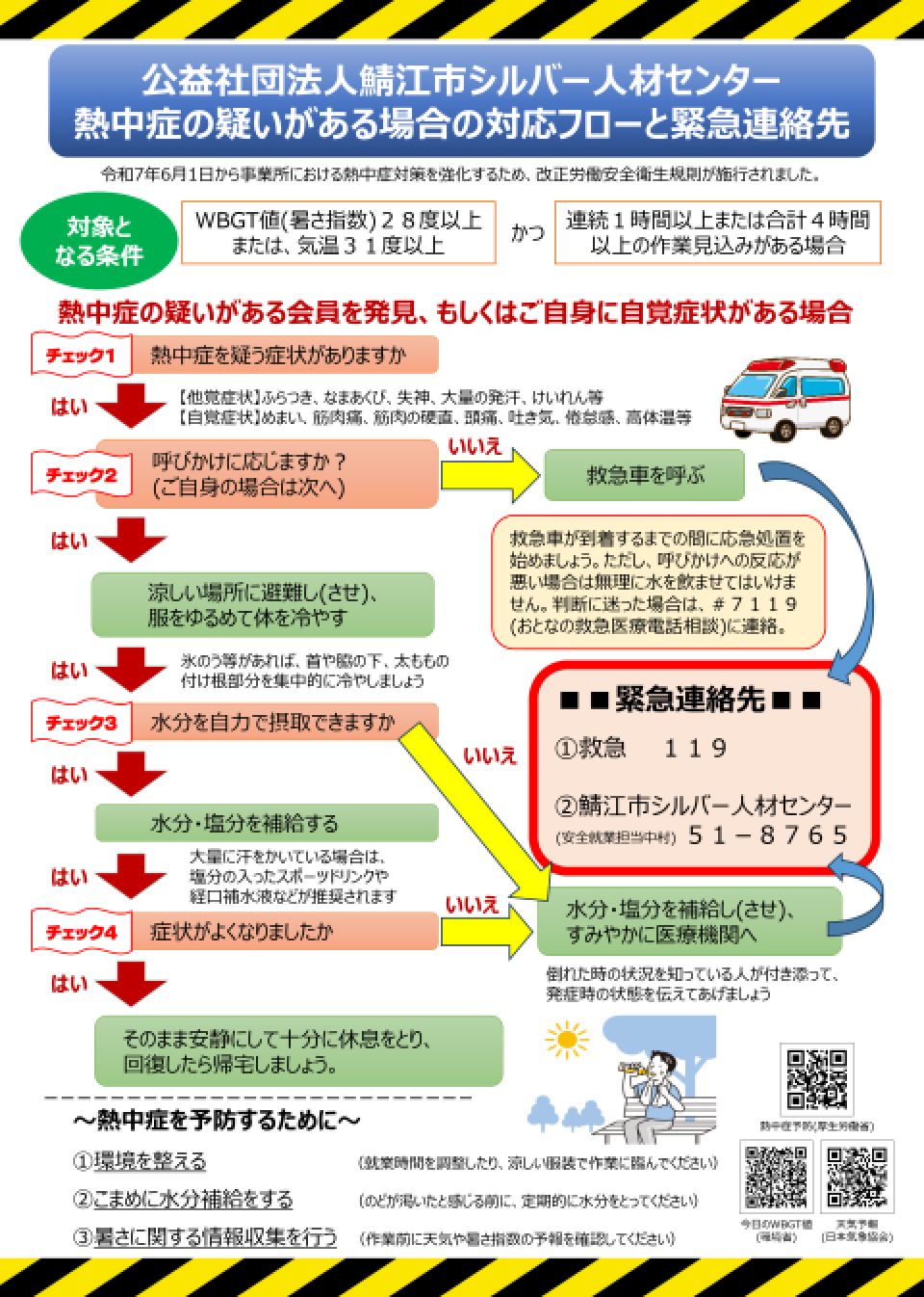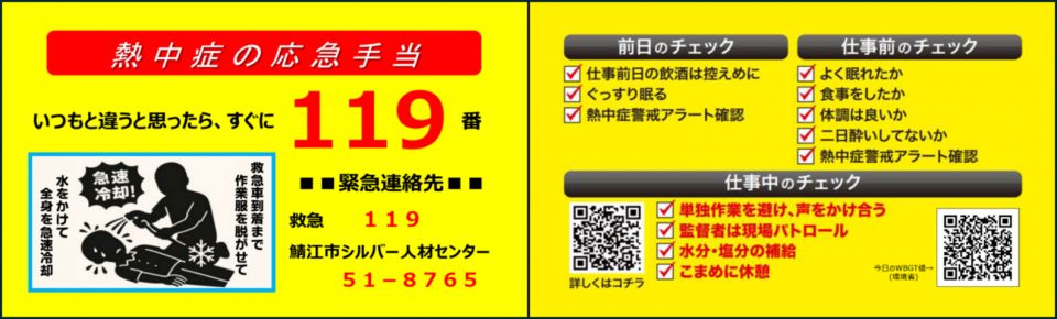 もし、あなたが「熱中症の疑いがある人と遭遇した場合、またはご自身に自覚症状が感じられた場合」の『対応フロー』と『応急手当カード』を印刷出来るようにしました。お仕事ファイルに入れて緊急時に備えておきましょう。