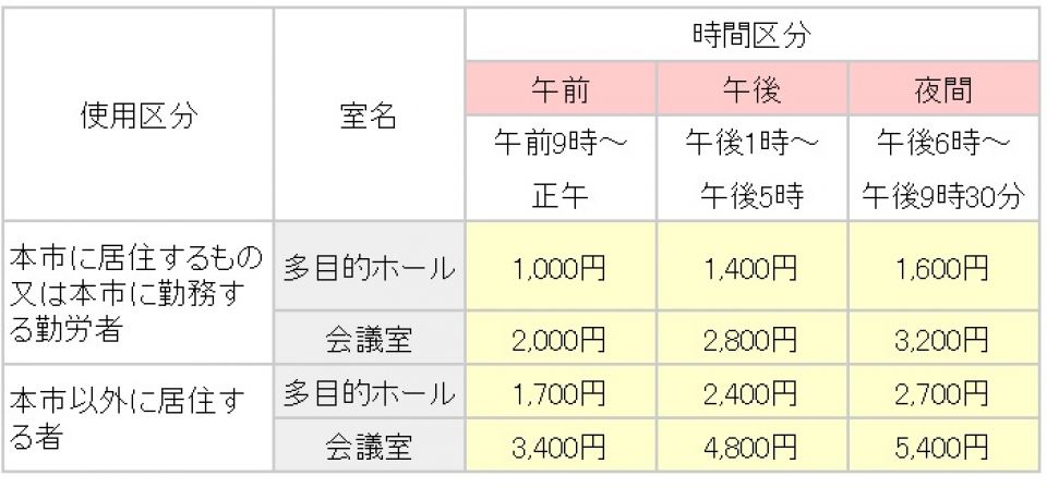 ◆使用料 ※表をクリックすると拡大表示します(パソコンのみ)
