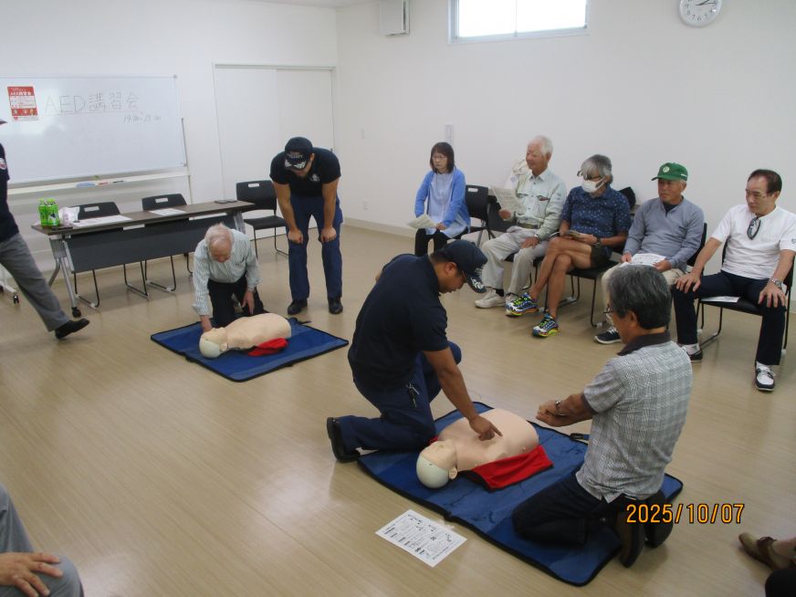 令和7年10月7日(火)に佐野市消防様をお招きし、AED講習会を開催しました。会員16名と職員が参加しました。