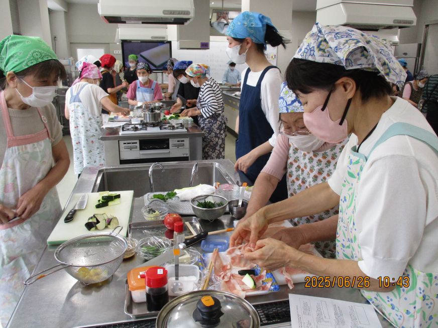 「シルバークッキング教室」を佐野日本大学短期大学にて開催しました。先生,学生の皆さんが夏の暑さに負けない素敵なメニューを考えて下さいました。学生の皆さんの協力を得ながら調理を行うことで作業を通じて世代間の交流を図る貴重な機会となりました。