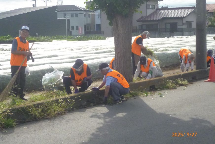 A 狭山市より委託された除草作業です。各地区で指定された市道を地区委員長と地域班長を中心に会員みんなで実施します。