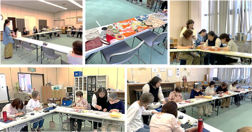 今回も、精華台で本格的に裁縫を教えられている先生方々が来て下さりました。それぞれ、作りたい作品を考えながら、分からない所は、先生にアドバイスをもらったり、手伝ってもらいながら、取り掛かります。時折おしゃべりを交えながら、とても楽しい時間になりました。参加された会員の中には、着なくなった着物の糸をほどいて、リメイクを考えている方もいらっしゃいました。まだまだ始まったばかりのお針子教室。これからが楽しみですね。