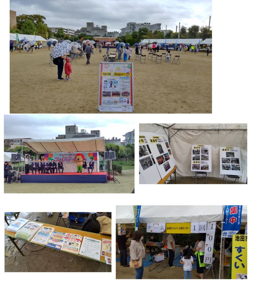北部ブロックフェスティバル ◆社会奉仕活動 2024年10月19日(土)フェスティバルを実施しました あいにくの雨となりましたが、何とか実施することができました。10時15分「北摂チアリーディングクラブDEARS」の可愛らしい演技で開幕しました。人気キャラクターとの記念撮影は、たくさんのお子さまに喜んでいただけました。当センターのバケツゲームは、景品の一つである「ピコピコハット」がとても人気で、ゲームを楽しんでいただきました。来年は箕面市開催です。また楽しい景品を用意してお待ちしています。 シルバー人材センターフェスティバルのご案内 今年もシルバー人材センターフェスティバルが開催されます。ぜひ参加ください。 島本町シルバー人材センターはゲームをします。 日時:2024年10月19日(土) 10:00~15:00 会場:池田市豊島野公園