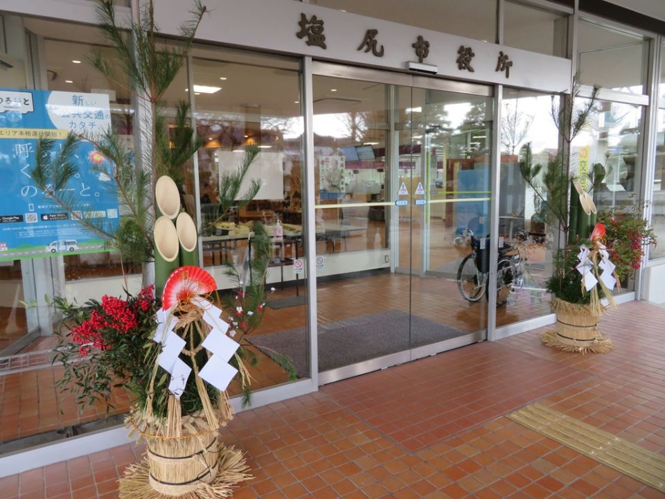 塩尻市役所玄関に門松を贈呈して飾りました