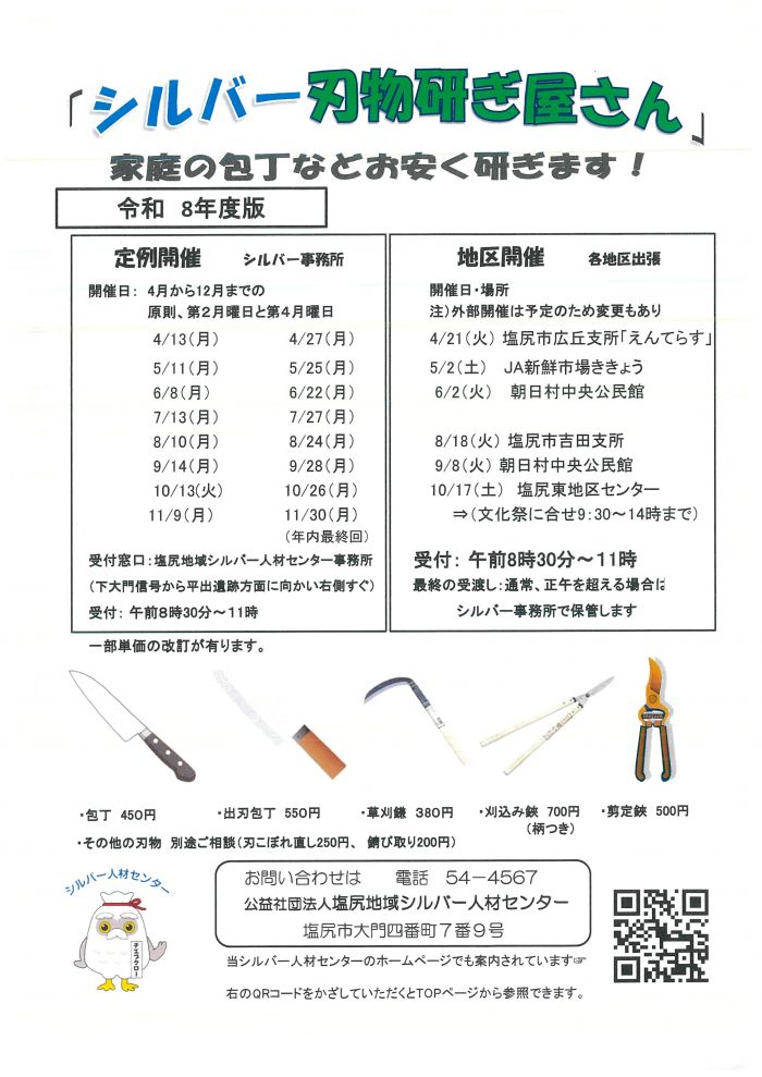 令和8年は4月13日(月)より開催を予定していますので、どうぞご利用下さい。シルバー事務所での開催日は原則第2月曜日と第4月曜日となります。開催期間は4月~11月まで実施致します。地区開催を含めて実際の開催日等詳細は下記予定表をご覧下さい。尚、本年も「のこぎり」と「ラシャ切り鋏」の取り扱いは致しません。