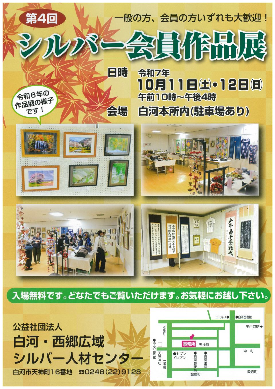 10月5日(土)10:00~15:00に、第3回会員作品展が、マイタウン白河地下大会議室で開催されました。切り絵や書、写真、木工品、縫い物の手芸品など、約300点の会員手作りの力作が展示され、5時間と短い時間の展示でしたが、100名以上の方にご来場をいただきました。