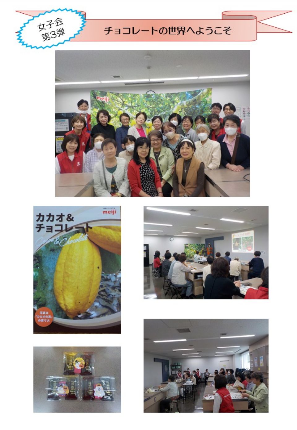 明治の食育セミナー 「チョコレートの世界へようこそ」を開催しました。(株)明治の講師の方より、知らせざるチョコレートの世界、歴史、カカオの種類、製造工程やチョコレートが手元に届くまでの様々な説明を受けました。皆さん 知っていましたか?カカオの栽培からチョコレートになるまで最低10年の歳月を要するんです。カカオの種類や焙煎方法等によってはチョコレートの世界はINFINITY(無限大)。当日は、明治のチョコレートの中から、2種類を食べ比べ。ベネズエラ産のカカオを使用した「ナッティカカオ(ナッツのような香ばしい、奥深いコク)」とドミニカ共和国産のカカオを使用した「フルーティカカオ(フルーツのような酸味、力強く複雑な香り)」 女子会は、≪初めましてで おともだち≫いつの間にか笑顔でおしゃべりが止まりません。 お土産は 来年100周年を迎える 明治のミルクチョコレートとストロベリーチョコレート。最後に参加者全員で記念撮影 ~ハイ!カカオ~