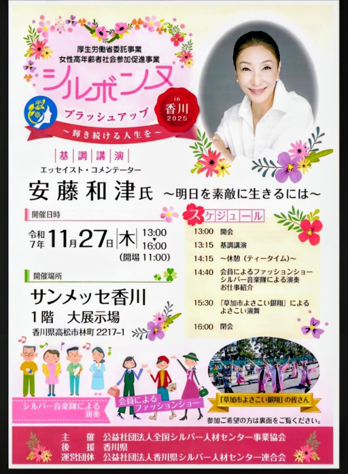 よさこい銀翔は、平成27年に立ち上げ11年目になります。現在メンバーは33名で毎週練習を頑張っています。「銀翔」はシルバー人材センターの宣伝大使として市内の様々なイベントに参加し、演舞をしながらシルバーのPRを行っています。昨年は大宮のソニックシティで演舞を披露し、今年は11月に高松のサンメッセ香川で演舞を披露する予定です。よさこいを通して「健康」「仲間」「生きがい」ができ、やりがいを感じて充実しています。是非、見かけたら応援してください!