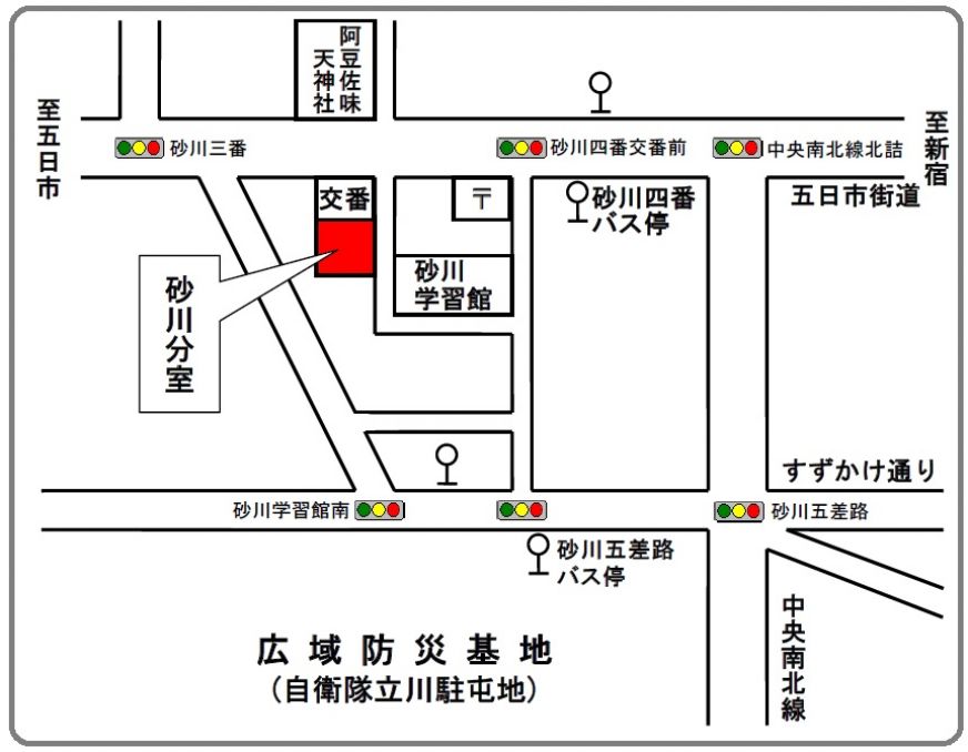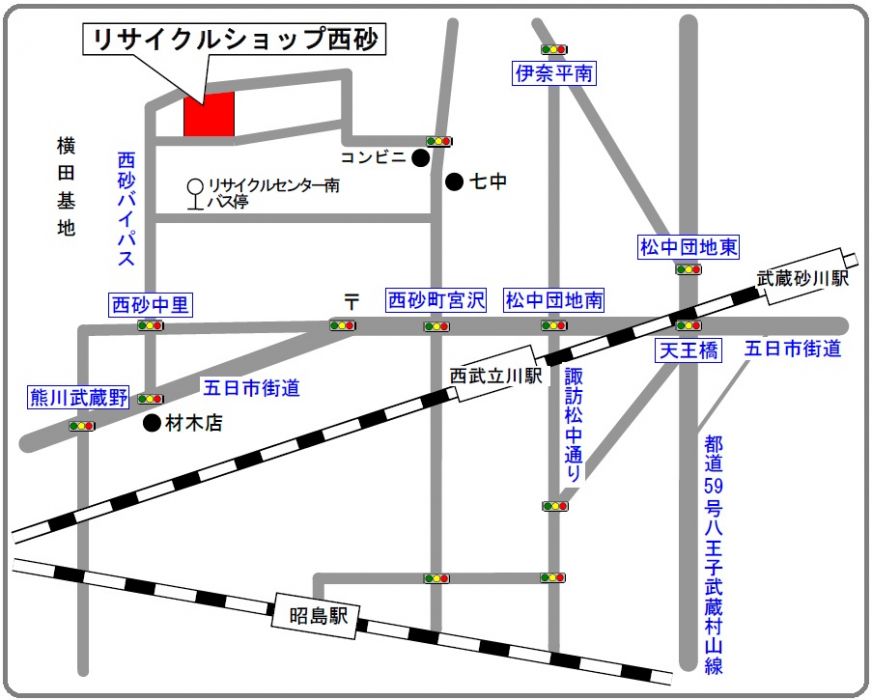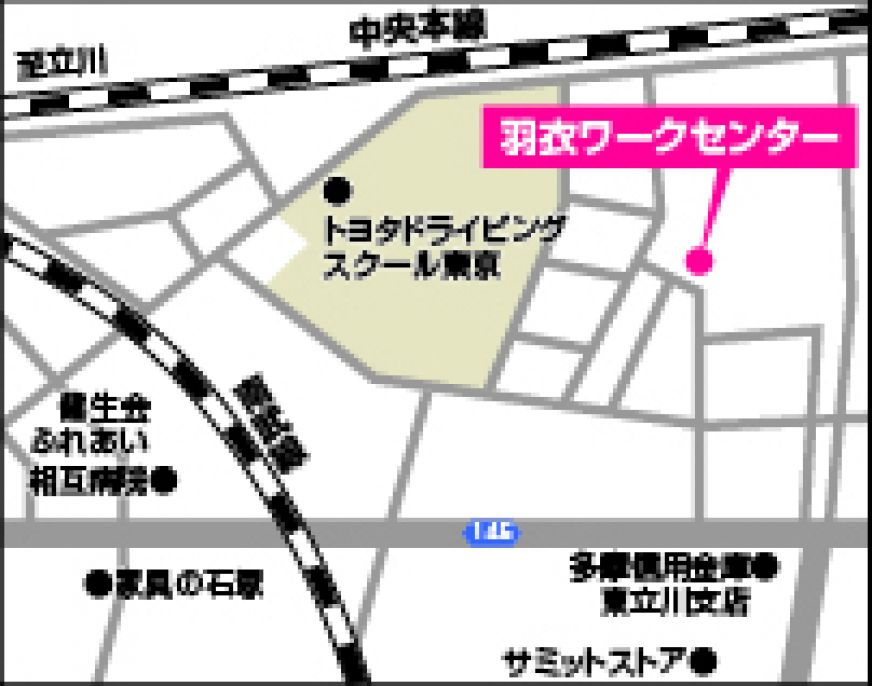 施設案内 施設案内 公益社団法人 立川市シルバー人材センター本部 〒190-0023 立川市柴崎町1-17-7 TEL:042(527)2204 FAX:042(527)2220 交通機関 ・【JR中央線】 立川駅から徒歩15分 ・【多摩都市モノレール】 柴崎体育館駅から徒歩10分 立川南駅から徒歩15分 ↑地図をクリックすると 拡大表示されます。 錦支部 〒190-0022 立川市錦町6-15-20 TEL:042(528)8041 FAX:042(528)8043 交通機関 ・【JR南武線】 西国立駅から徒歩15分 ・【JR中央線】 立川駅から徒歩25分 ↑地図をクリックすると 拡大表示されます。 羽衣ワークセンター 〒190-0021 立川市羽衣町1-12-18 交通機関 ・【JR南武線】 西国立駅から徒歩9分 ・【JR中央線】 立川駅から徒歩18分 ↑地図をクリックすると 拡大表示されます。 リサイクルショップ西砂(西砂リサイクル事業所) 〒190-0034 立川市西砂町4-77-1 TEL:042(569)3666 販売日 :年末年始を除く 毎週火曜~日曜[月曜日定休] 販売時間:午前10時~午後4時 交通機関 【くるりんバス】 ・JR青梅線「昭島駅」北口 もしくは 西武拝島線「西武立川駅」南口から、 くるりんバス“西砂ルート”乗車、 ↑地図をクリックすると 「リサイクルセンター南」下車、徒歩5分 拡大表示されます。 ・JR立川駅方面からは、立川駅北口発松中団地操車場行バスに乗車し、 終点「松中団地操車場」でくるりんバス“西砂ルート”に乗り換え、 「リサイクルセンター南」下車、徒歩5分 砂川分室 〒190-0031 立川市砂川町1-52-17 TEL:042(534)3222 FAX:042(534)3222 . . . ↑地図をクリックすると 拡大表示されます。