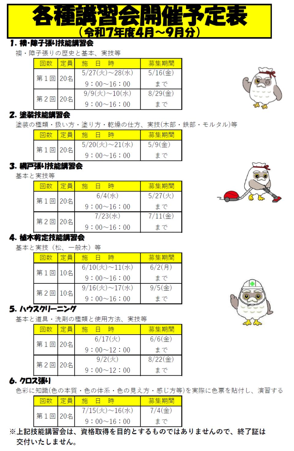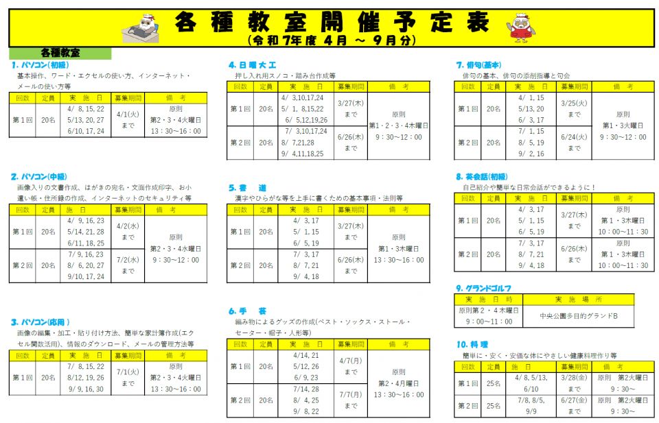 技能講習会・各種教室・スポット教室のご案内 ワークプラザ技能講習会・各種教室のご案内 ワークプラザ技能講習会・各種教室のご案内 令和7年10月~令和8年3月の技能講習会 ≪各種教室3ヶ月コース≫令和7年10月~令和8年3月”社会参加いきいき教室” スポット“楽しく仲間づくり”教室 スマホ教室 注意事項