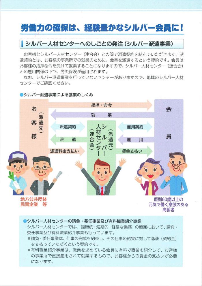 「シルバー派遣事業」とは、公益社団法人岐阜県シルバー人材センター連合会(※以下連合会)が、シルバー人材センター会員のみを対象として行う一般労働者派遣事業です。