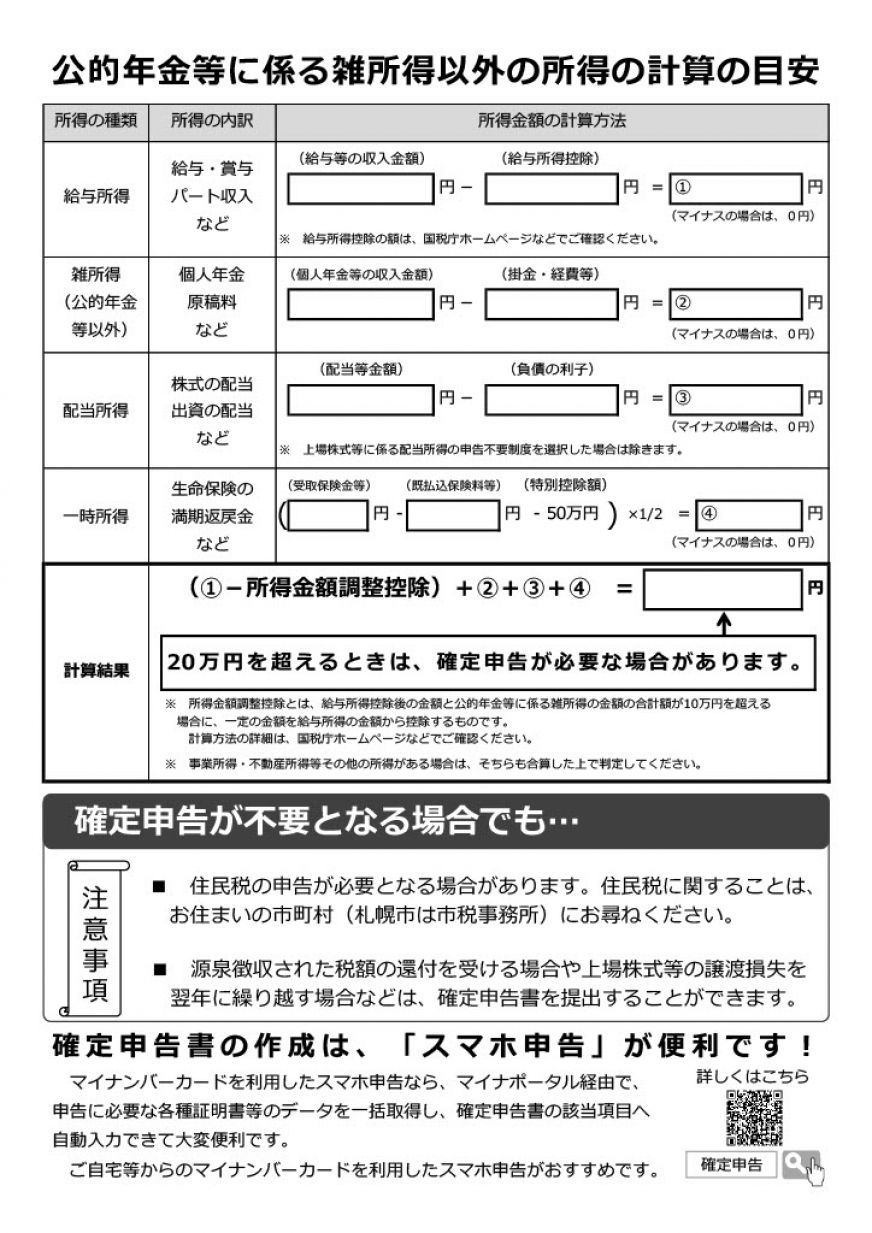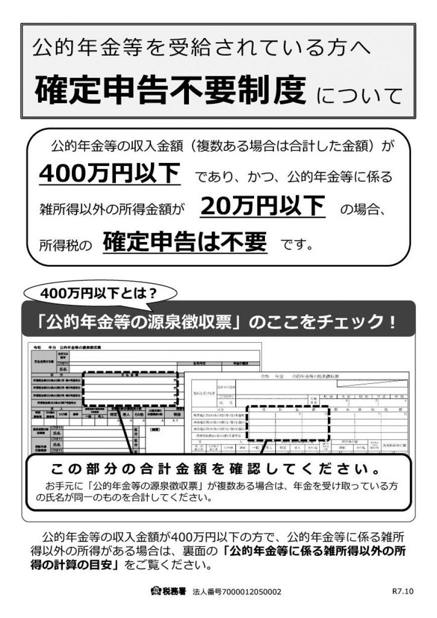 なお、当ページ下段の「お知らせの資料」に【年金受給者に係る確定申告不要