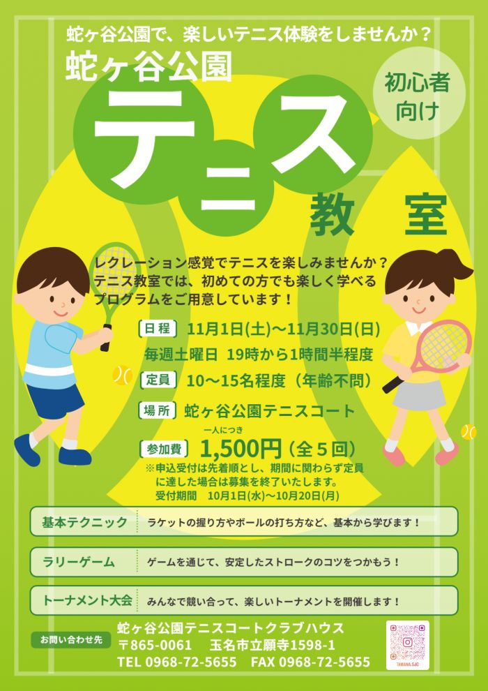 玉名市蛇ヶ谷公園にて、初心者の方を対象としたテニス教室を開催します!