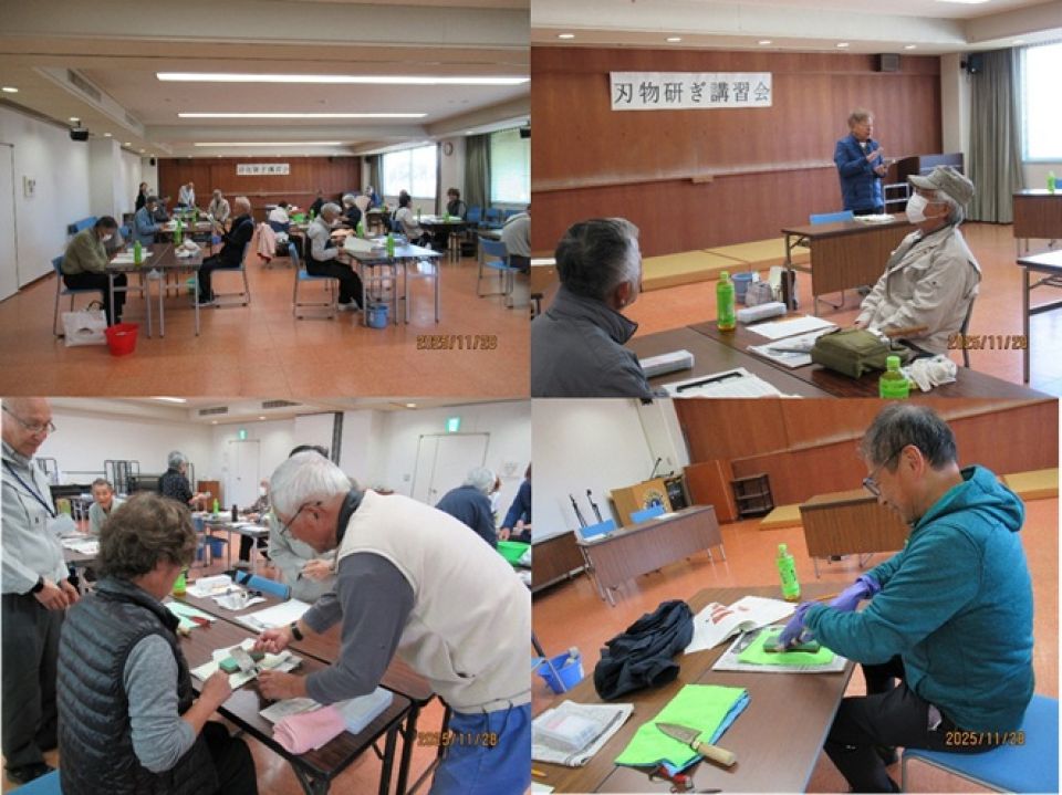 11月28日(金)たつの市福祉会館大会議室にて、初めてとなる刃物研ぎ講習会を開催しました。講師には、(株)石樹園会長の松本氏 をお招きし、初心者でも分かりやすい基本の研ぎ方を実演・指導していただきました。当日は、シルバー会員および市内在住の方から、男性14名・女性4名の計18名にご参加いただきました。皆さん砥石を使いながら熱心に取り組まれていました。初開催ながら大変好評で、参加者からは「研いだ包丁を使うのが楽しみ」「ピカピカになった」といった声が多く寄せられました。