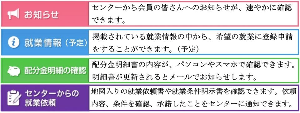 会員とシルバー人材センターが、お仕事に関連する情報等をやり取りする会員専用サイトです。会員の皆様がスマホやパソコンでいつでも閲覧することが出来ますので、センターまで是非お申し込みください。