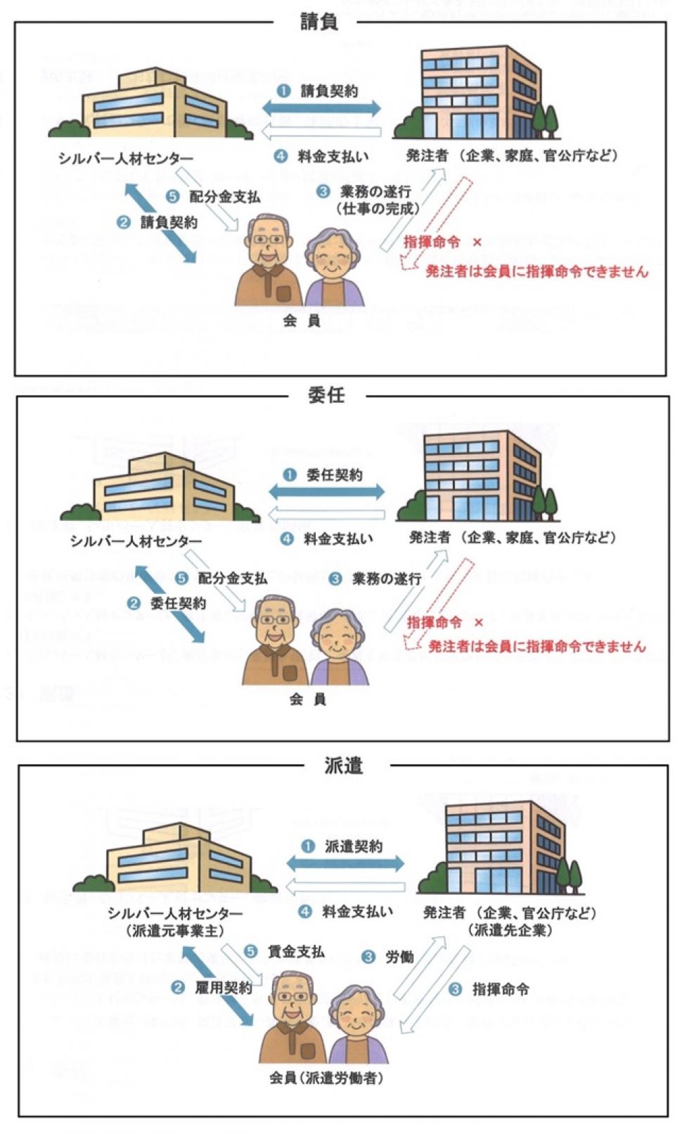 シルバー人材センターを通じての働き方には、「請負・委託による就業」と「派遣による就業」の二つの形態があります。