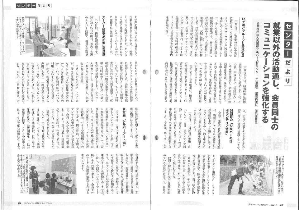 【ニュース】最近の活動・話題 最近の活動や話題をお伝えします シルバーアート展を開催しました 令和7年10月11日(土)天童市健康福祉まつりが市総合福祉センターで開催されました。 この行事に合わせて当センターも文化祭展示。手芸品、折り紙、飛行機の模型、絵画など、会員さんの力作を展示しました。 シルバーアート展は、10月11日はお昼まで。 多くの市民の皆さま・会員さんにご覧いただきたく、10月14日(火)から17日(金)お昼まで、当センター事務室に展示します。 月刊シルバー人材センターに載りました 全国シルバー人材センター事業協会が編集する「月刊シルバー人材センター」4月号に、当センターが登場しました。シルバーの日ボランティア、街頭広報、シルバーアート展など就業以外の活動を通じて、会員拡大や地域貢献、会員同士のふれあいを、事務局の海老名主任が見開きページにまとめました。せひ、ご覧ください。 月刊シルバー人材センターのバックナンバーは、事務所にありますので、いつでも見に来てください。 女性限定説明会 豊かなシニアライフを求めて… 10月20日、当センターは「女性だけの入会説明会」を開催しました。 7名の参加がありました。 主催者側として渡邉・庄子・瀧口、3名の女性理事がていねいにシルバー事業の説明をおこないました。 参加した7名のうち5名が11月に入会し、シルバーに仲間入りしました。 秋晴れの下で グラウンドゴルフ交流大会 会員互助会もみじ会は10月14日、天童市グラウンドゴルフ場で同大会を開催しました。 昨年はコロナで中止、一昨年は夏まつりだったので、3年ぶりのグラウンドゴルフになりました。(グラウンドゴルフ・夏まつり 隔年で開催でした) 26名の会員が参加し、和気あいあいのプレーになりました。 ★優 勝 国井美佐江さん ★準優勝 柳瀬 昇さん ★第3位 金木 稔さん 参加者全員に豪華な賞品が贈られました。 天童市長に表敬訪問! 令和3年10月6日、当センターの三役が天童市役所を訪問。 近藤理事長は山本市長に日ごろのお礼と当センターの近況を報告するとともに、全シ協総会で採択した要望文を手渡しシルバー事業へのさらなる援助をお願いしました。山本市長は消費税のインボイス制度に関心を持たれ、シルバー会員の配分金への影響について心配されていました。 その後、天童市議会を訪問し、新たに就任した村山議長と懇談しました。