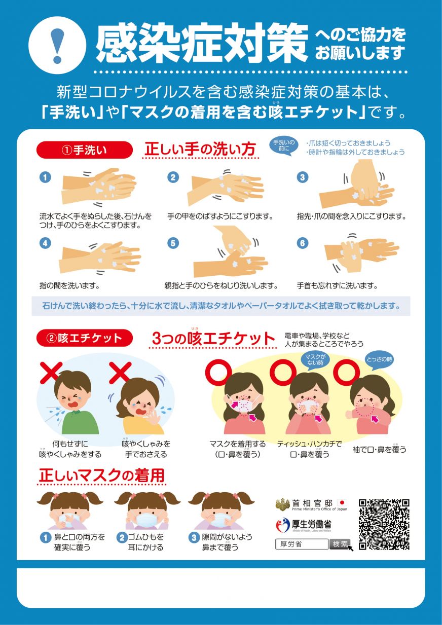 正しい手洗い、咳エチケット、3つの密を避けることがコロナウイルス予防に効果が高いとされています。同封したチラシに書いてあることを実践して、感染防止に御協力ください。