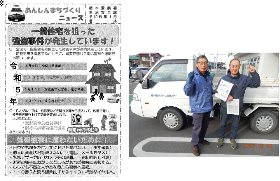 ボランティア活動 活動の内容 防犯啓発活動 令和5年1月より、地域貢献の一環として、栃木警察署が発行する会報誌【あんしんまちづくりニュース】を作業でお伺いしたお客様宅に配布し、防犯啓発を行っております。 ボランティア活動(栃木地域) 令和7年12月3日(水) 蔵の街大通り(万町交差点~栃木駅北口)や旧警察署跡地駐車場の清掃作業を実施しました。 会員と職員が参加し、蔵の街大通りをウォーキングをしながらゴミ拾いを行いました。 ボランティア活動(大平地域) 令和7年11月21日(金) 東武新大平下駅東口ロータリー及び駐輪場にて 会員と職員が参加し、ゴミ拾いや落ち葉拾い等を行いました。 ボランティア活動(藤岡地域) 令和7年4月12日(土) 渡良瀬運動公園にて 会員と職員が参加し、ゴミ拾い等を行いました。 ボランティア活動(都賀地域) 令和7年12月6日(土) つがの里にて 会員と職員が参加し、ゴミ拾いや落ち葉拾い等を行いました。 ボランティア活動(西方地域) 令和7年12月4日(木) 西方ふれあいパークにて 会員と職員が参加し、ゴミ拾いや落ち葉拾い、側溝清掃を行いました。 ボランティア活動(岩舟地域) 令和7年11月8日(土) 静和地区公民館にて 会員と職員が参加し、ゴミ拾いや落ち葉拾い等を行いました。