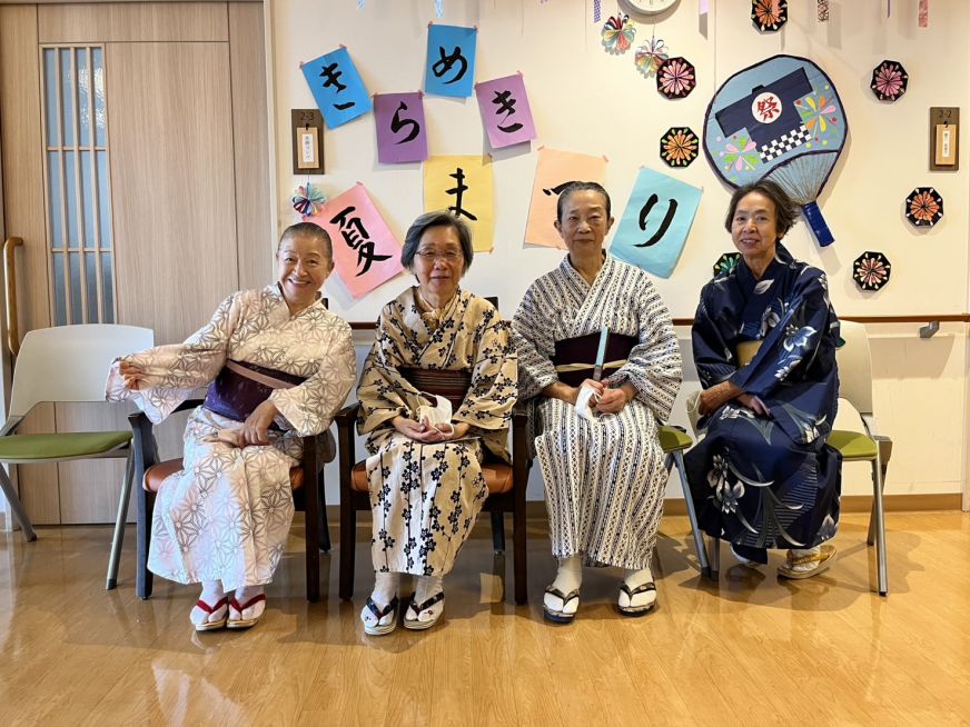 戸田市シルバー人材センター着付け教室の会員4人が入居者様に浴衣の着付けをし、それが終わると『夏まつり』の開始です。