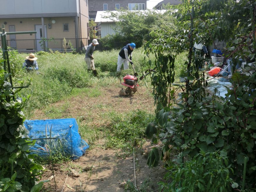 【作 業】3週間目の畑なので、夏草が伸び放題、柄の長い鎌の他に小型チェーンソーを用意した会員もおり、ほとんどの雑草を処理しました。