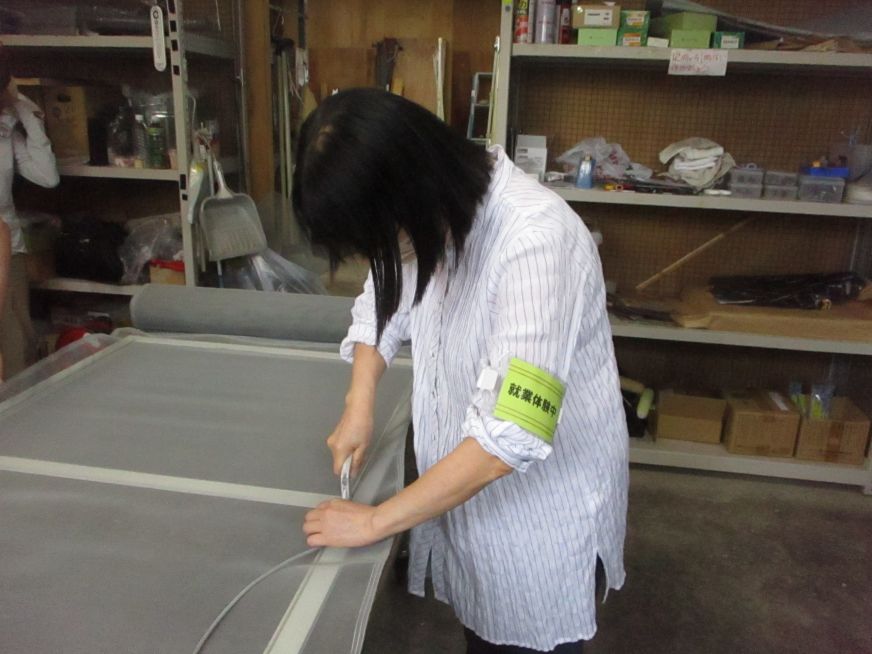 説明会終了後は就業体験があり、筆耕と網戸・障子の張替えを体験しました。